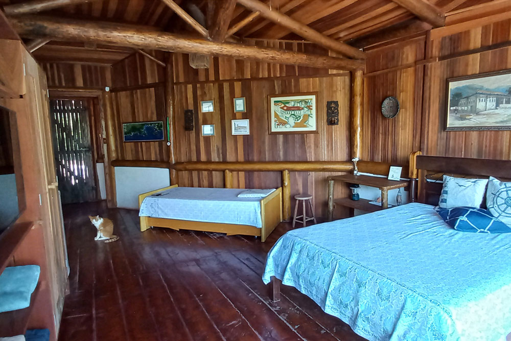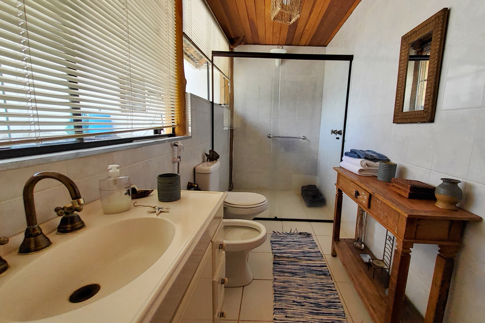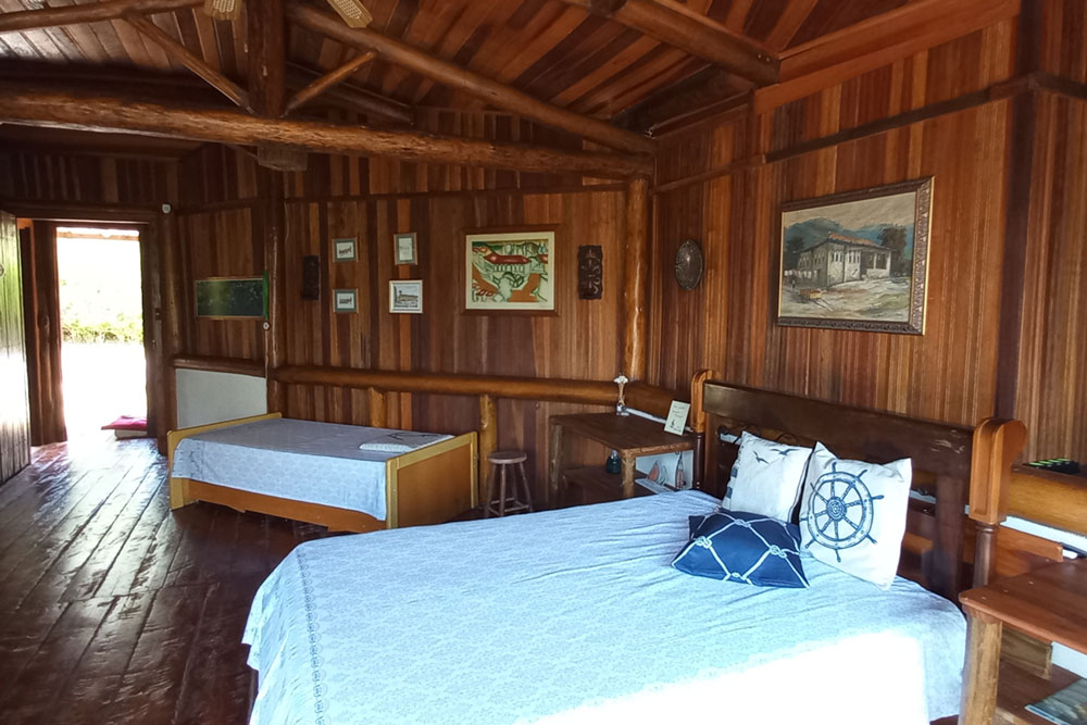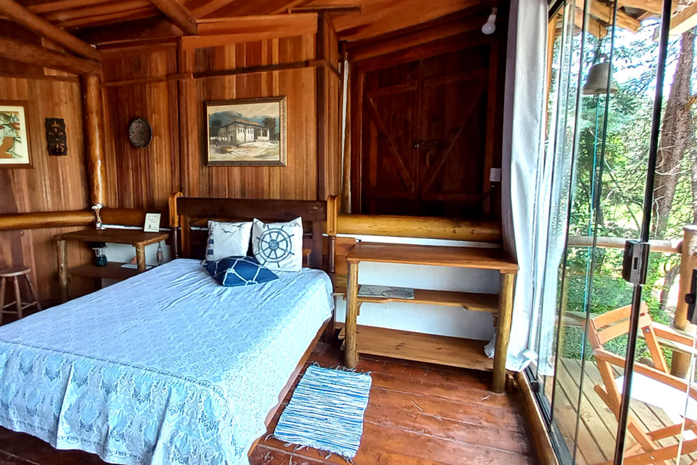 A Suíte Devaneio conta com cama de casal mais uma bicama (2 solteiros ou outro casal), frigobar, TV, wifi, banheiro completo, sem banheira.