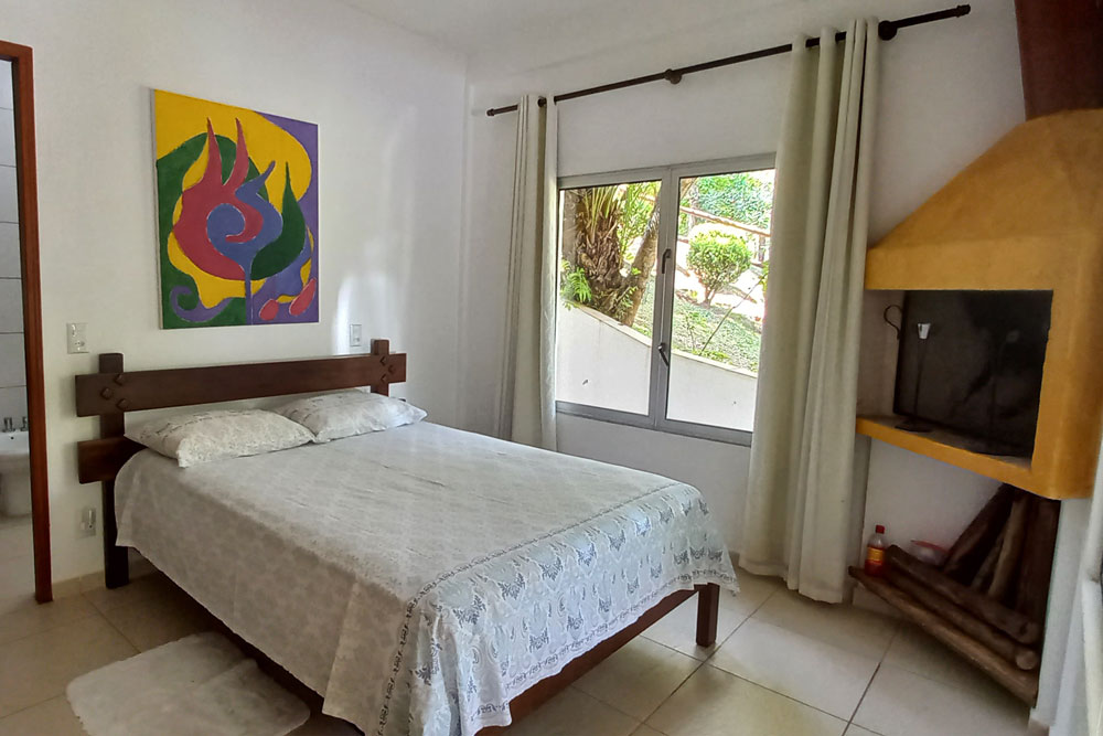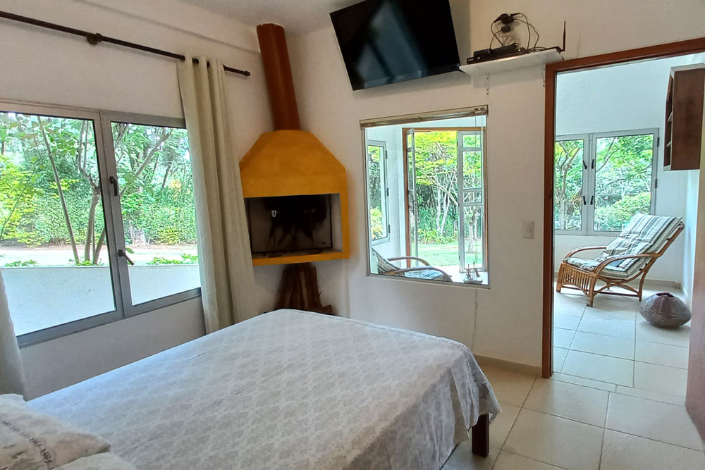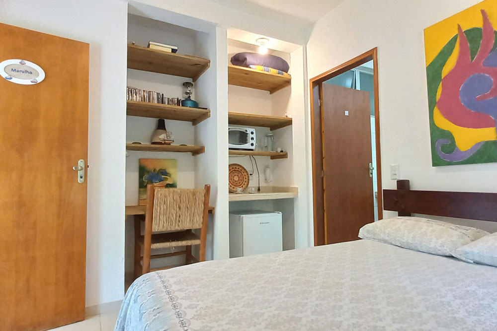 A Suíte Marulho é equipada com cama de casal, lareira frigobar, filtro de água doce, cafeteira, forninho