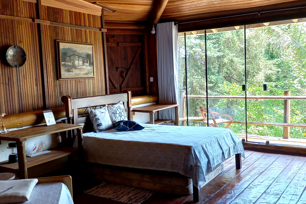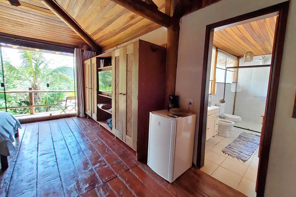 A Suíte Devaneio conta com cama de casal mais uma bicama (2 solteiros ou outro casal), frigobar, TV, wifi, banheiro completo, sem banheira.